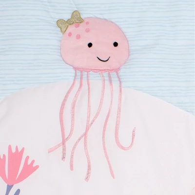 This three-piece under-sea ocean themed crib bedding set includes one quilt, one breathable 100% cotton fitted crib sheet, and one shirred crib skirt. Your child will be perfectly cozy in this luxurious aquatic habitat. An adorable 27” long dolphin is appliqued in a super soft lavender velour and her tummy is white ribbed velour. The mommy and baby turtles are appliqued in green ribbed velour with colorful rainbows. A cute jellyfish is a light pink minky with a pretty gold bow and six gentle embroidered tentacles. A darling little seahorse is appliqued in green velour with blue trim. The breathable 100% cotton fitted crib sheet is decorated with dolphins, sea turtles, jellyfish, sea horses, small fishes, and coral. There is elastic all the way around ensuring a safe and secure fit on a standard sized crib mattress measuring 28” X 52”. The crib skirt adds the finishing touch to your child’s crib. The shirred panel is a cotton twill blend in a light pink with a rose-colored bubble pattern which is shared with the back of the quilt. The bottom is a solid mint twill with pink pom pom trim in between. It has a 14 ½” drop and all items are machine washable for easy care.